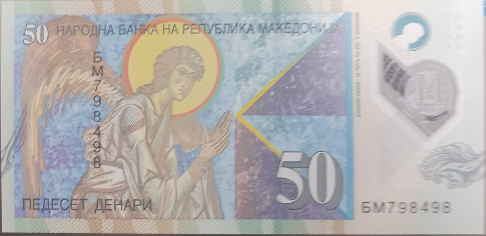 | Imagen del arcángel San Gabriel en el reverso del billete (detalle del fresco del altar de la iglesia de San Jorge en Kurbinovo) |